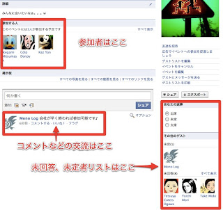 これもかなり使える機能の一つであるイベント機能。これはオフ会、勉強会、パーティなどで大活躍する。まずイベントメニューからイベントを作成、をクリック。